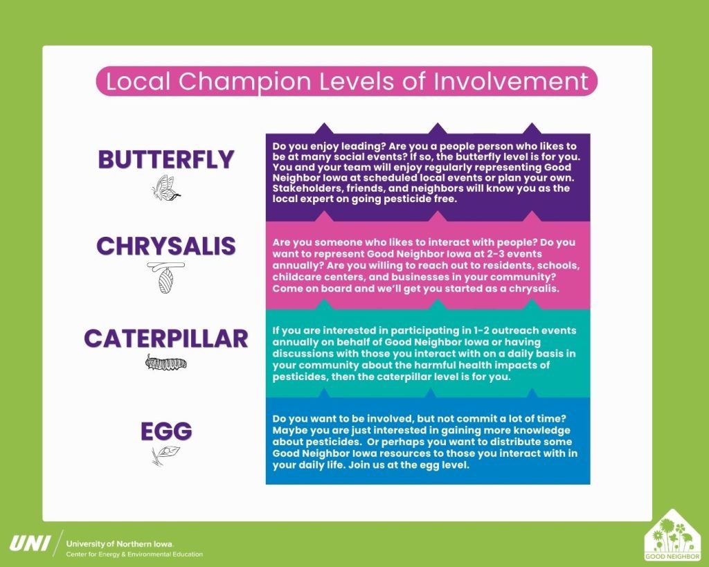 Becoming a Local Champion doesn’t mean you have to commit a lot of time or be a lawn‑care expert. Good Neighbor Iowa offers several levels of involvement so everyone can participate in a way that fits their life. Some begin at the Egg level, building their own understanding of pesticides and sharing simple, trusted resources with family, friends, and neighbors in their everyday lives. Others grow into the Caterpillar level, where they participate in occasional outreach events or have meaningful conversations about pesticide‑free practices with people they regularly interact with. At the Chrysalis level, Champions take a more active role by representing Good Neighbor Iowa at community events, engaging residents, schools, or local organizations, and helping spread awareness more broadly. A few take the next step and emerge as Butterfly Champions, local leaders who help organize outreach, mentor others, and serve as a trusted community voice for pesticide‑free solutions. No matter where someone begins or how far they choose to grow, every Champion plays a valuable role in creating healthier, safer neighborhoods.